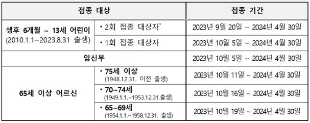 1회접종대상 : 2023. 10. 5. ~ 2024. 4. 30.